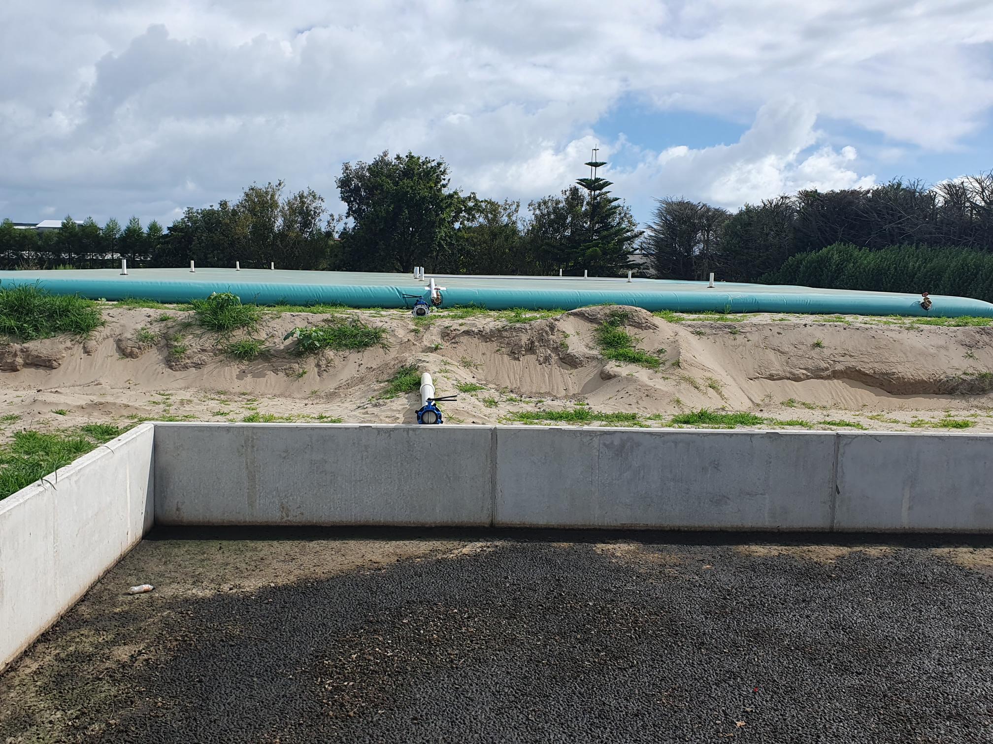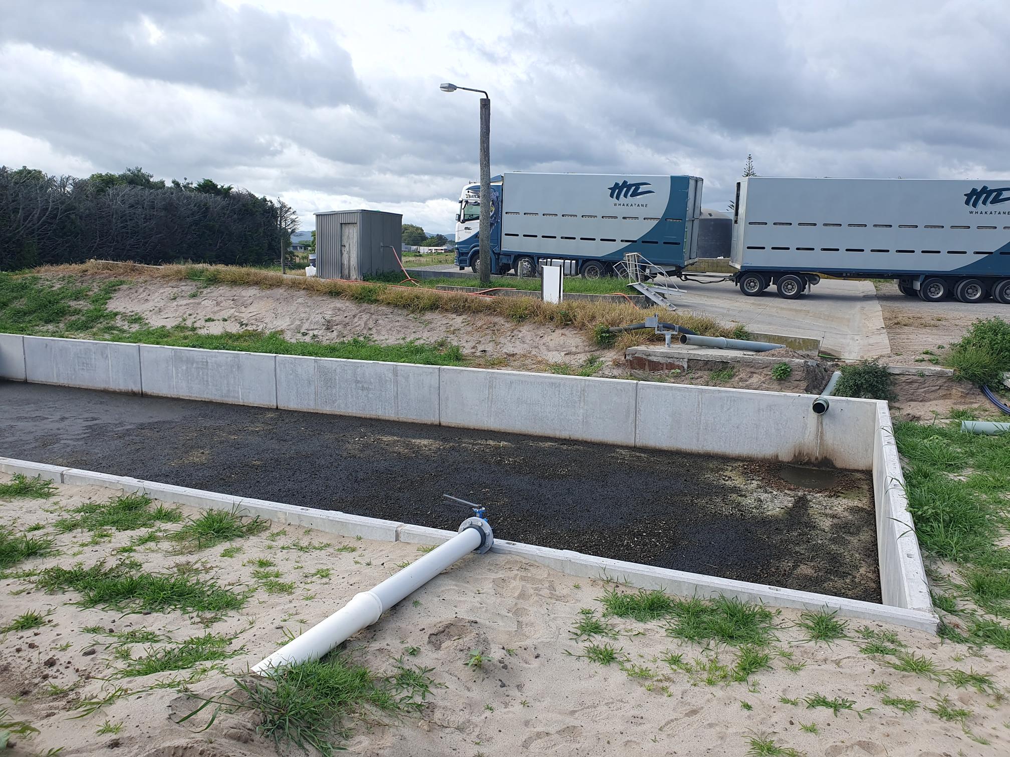This particular system involves the stock effluent from the truck going directly to a weeping wall. The liquid part of this is then pumped to the Vortex Bladder for storage, whilst the solids remain in the weeping wall, the solids include sand, grit, and stones.