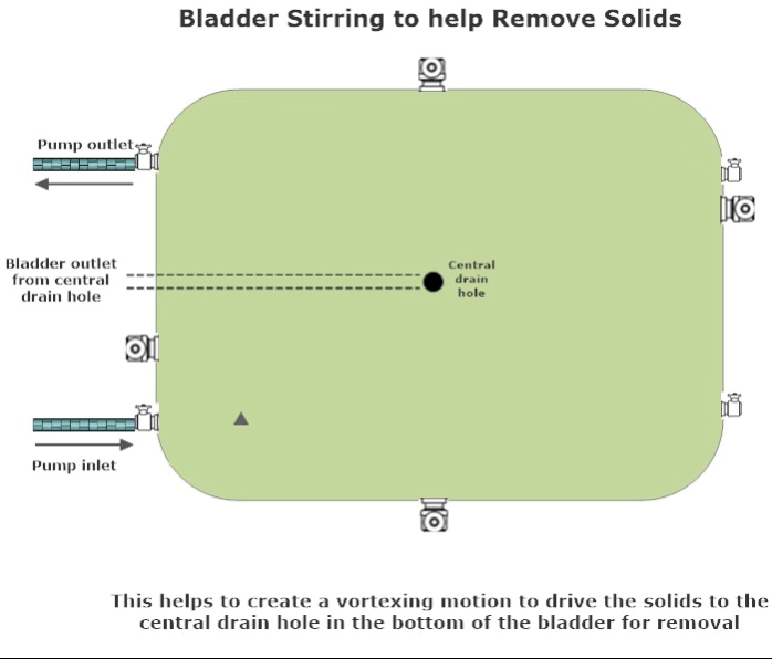 - Then by creating motion of the liquid and solids using a specialized stirring system only available to the Vortex Bladder, the solids are driven to the centre of the bladder where the drain hole is. This only needs to be done periodically and not every time you pump from the bladder